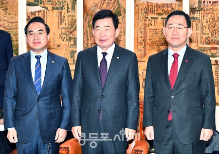 김진표 국회의장은 15일 국회에서 박홍근 민주당 원내대표와 주호영 국민의힘 원내대표를 만나 “15일 오후 본회의 전까지 여야 합의안을 마련해 달라”라고 당부했다.