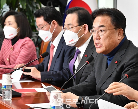 정진석 비대위원장은 22일 국회에서 열린 비상대책위원회 모두 발언에서 “문재인 정권은 통계 조작으로 국민의 눈과 귀를 막아버렸다”며 이같이 비판했다. 정진석 비대위원장은 문재인 정부에서 시행한 “최저임금 인상, 서울 주택가격 상승” 등의 통계를 꼬집고 “이 정도 통계조작이라면 국정농단을 넘어서 국정 사기극에 가깝다”라며 “감사원은 이런 범죄행위에 전모를 철저히 밝혀내야 한다. 문재인 전 대통령은 통계 조작과 관련해 국민께 사과해야 한다”라고 주장했다. 정진석 비대위원장은 “문재인 전 대통령이 말했던 ‘참이 거짓이 이기는 나라’ 저희 국민의힘과 윤석열 정부가 반드시 만들겠다”라고 덧붙였다. 주호영 원내대표는 “어제 현장 조사를 시작으로 이태원 국정조사가 다시 시작됐다”라며 “이번 이태원 국정조사는 그야말로 진실 발견과 재발 방지에만 집중해야 한다”라고 말했다. 주호영 원내대표는 “누구도 정권에 타격을 주기 위한 목적으로 국정조사를 이용해서는 절대 안 된다”라며 “만약에 국정조사를 정쟁에 이용하던지 이태원 사건을 정권에 타격을 주는 목적으로 이용하는 사람들은 당연히 비판받아야 한다”라고 강조했다. 주호영 원내대표는 “희생자나 그 부모들은 위로받고 보호받아야 할 분들이지 잘못이 있는 것이 아니다”라며 “그래서 희생자나 그 유족들을 상대로 폭언한다든지 비난하는 일은 옳지 않다”라고 밝혔다. 주호영 원내대표는 “어려움이 생기면 같이 아픔을 나누고 고통을 함께함으로써 치유하고 하나가 돼야 한다”라며 “유족이나 희생자들에 대해서 폭언한다든지 근거 없는 비난하는 일은 삼가시기를 바란다”라고 당부했다.