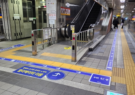 어르신・장애인 등 교통약자와 외국인 이용객의 승강기 이용 접근 편의성을 위한 ‘엘리베이터 이용유도 안전동선 세이프 로드’(아래 ‘세이프로드’)가 설치됐다. 승강장 바닥에 설치된 세이프 로드, 바닥의 유도띠만 따라가면 엘리베이터까지 손쉽게 도달할 수 있다.