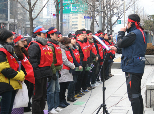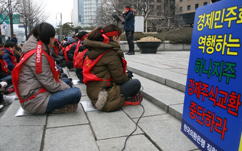 “자사고 250억원 지원이 사회공헌인가” 금융위 의혹해소 나서야 모든 문제의 근원은 바로 돈? 금융권부터 투명해야 새 시대가 열린다. 외환은행 노조가 연일 뜨겁다. 25일 박근혜대통령 취임식의 여운이 사라지기도 전에 26일 오전, 전국에서 연차휴가를 낸 외환은행 직원들이 서울 태평로에 소재한 금융위 앞에서 집회를 열었다