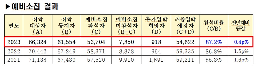 추가 입학 희망자 918명을 포함하여 최종입학예정자는 총 54,622명으로 예비 소집 참석자 대비 최종입학예정자는 87.2%로 전년 대비 0.4%p 증가했다. 취학대상자는 총 66,324명이다. 서울시교육청이 1월 16일 발표한 결과에 따르면 이같이 나타났다. 서울시교육청은 2023년 1월 4일에서 5일까지 이틀간 진행한 바 있다.