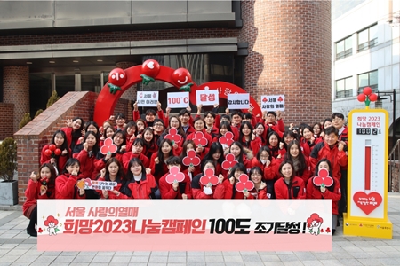 서울 사회복지공동모금회(회장 윤영석, 이하 서울 사랑의열매)가 “작년 12월 1일부터 1월 31일까지 진행하는 '희망 2023 나눔 캠페인' 나눔 목표액 456.7억을 조기 달성하며, 설 연휴를 이틀 앞두고 사랑의 온도 100도를 돌파했다”고 19일 오후 밝혔다. '희망 2023 나눔 캠페인'은 사랑의 온도탑이 서울지역 나눔 목표액 456억 7천만원 중 나눔 목표액 1%가 사랑의 온도 1도로 표시되었으며, 19일 457억원이 모금되어 사랑의 온도 100.2도가 달성됐다. 서울 사랑의열매 관계자는 “폐지 모은 돈을 기부하는 고령의 홀몸 어르신부터 게더타운 플랫폼을 활용 해 마련한 바자회 수익금을 기부 한 기업까지 모두가 나눔의 온도를 더욱 높여 주었다.”며 “특히, 전국 회원들을 위해 오프라인과 온라인 ‘메타버스’ 성금 전달식을 동시에 진행 한 프로골프 박성현 팬클럽 ‘남달라’와 임영웅 팬클럽 ‘영웅시대’는 점차 발전되는 팬덤 기부문화를 널리 알렸다.”고 말했다. 서울 사랑의열매 윤영석 회장은 “올해 캠페인을 시작할 때는 서울시민들의 힘든 상황 때문에 어려움을 예상했지만, 코로나19와 불경기에도 불구하고 시민들과 기업들뿐 아니라 각계각층에서 적극적으로 나눔의 손길이 이어져 목표를 달성할 수 있었다.”며 감사를 표했다. 캠페인 기간 내 모아진 성금은 관내 서울지역 어려운 이웃들에게 전달하며 다양한 분야에 사용된다. 지역사회 현안에 대한 발견 및 신속한 대응뿐만이 아니라 고독사 예방을 위한 사회적 고립 가구와 일상 회복을 위한 취약계층 지원, 사각지대 돌봄 가족을 위한 돌봄 사업 등에 사용할 예정이다.