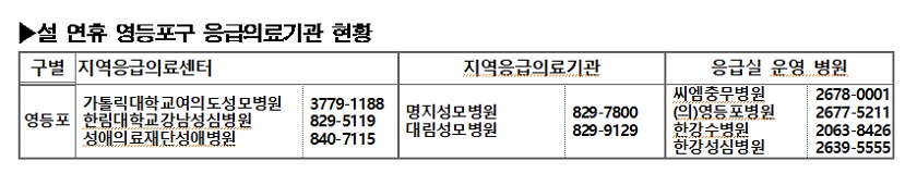 ‘문 여는 병·의원, 약국’ 정보는 25개 자치구 누리집에서... 설 연휴인 1월 21일부터 24일에도 영등포구민이 아프면 이용할 수 있는 지역 내 응급의료센터는 ▲가톨릭대학교여의도성모병원 ▲한림대학교 강남성심병원 ▲성애 의료재단성애병원 등이며, 지역 응급의료기관은 ▲명지성모병원 ▲대림성모병원이다. 또 ▲씨엠 충무병원 ▲영등포병원 ▲한강 수병원 ▲한강성심병원은 응급실을 운영한다.