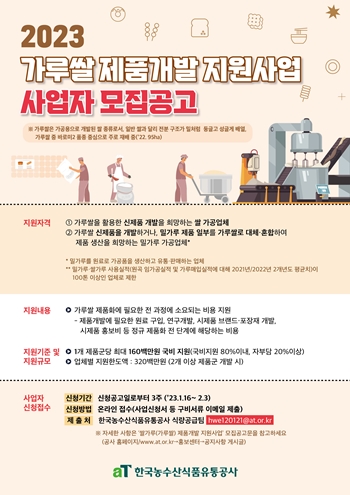 한국농수산식품유통공사(사장 김춘진)는 ‘가루쌀 제품개발 지원사업’에 참여할 사업자를 오는 2월 3일까지 공개 모집한다. 이 사업은 가루쌀 제품개발에 필요한 원료구입부터 연구개발, 포장, 시제품 생산, 평가 등 전 과정에 걸쳐 1개 제품군 당 국비 80% 보조로 최대 1억 6천만 원까지 지원하며, 지원규모는 15개 제품군으로 서류 및 발표 평가로 2월 중 최종 선정할 계획이다. 배옥병 수급이사는 “미래 식량안보 대응을 위한 가루쌀 시장의 포문을 열었다”라며, “이번 사업을 통해 국내의 우수한 가공업체들이 가루쌀 신제품 개발에 도전해보길 바란다”라고 말했다. 사업 신청서류는 2월 3일까지 이메일(hwe120121@at.or.kr)로 접수하며, 공사는 현업으로 바쁜 사업자들을 대상으로 ‘찾아가는 사업설명회’도 진행하고 있어 관심 있는 사업자들은 방문 상담 신청도 가능하다. 자세한 내용은 공사 누리집(www.at.or.kr) 공지사항에서 확인할 수 있다.