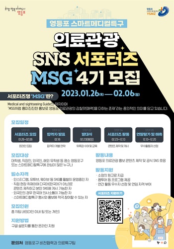 영등포구(구청장 최호권)가 의료관광 홍보 콘텐츠를 제작하고 이를 SNS를 통해 알리는 역할을 할 ‘SNS 서포터즈 MSG(Medical and Sightseeing Guide)4기’를 모집한다.