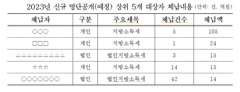 공개 제외 사유의 소명기회 부여 후 최종 명단 공개 예정 서울시가 3월 28일, 올해 1월 1일 기준으로 전국, 서울시, 자치구에서 관리되고 있는 지방세 체납액이 1천만원 이상인 자로 체납상태가 1년 이상이 지난 고액·상습체납자 신규대상자 1,540명을 선정했다.