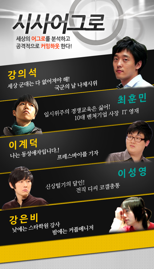 시사어그로는 국군의날 나체시위, 양심적 병역거부로 사회의 이슈를 만들어운 영화감독 강의석씨. 전경에서 동성애자 커밍아웃 육군전환복무신청으로 화제를 모은 이계덕씨,. 10대 벤쳐기업을 운영하다가 입시위주 경쟁교육이 싫다며 학교를 떠난 IT영재 최훈민씨. 낮에는 스타학원강사로 밤에는 커플매니져로 이중생활을 하고 있는 강은비씨. 마지막으로 일간베스트 저장소 회원이면서 동시에 디시인사이드 전직 코갤총통. 그리고 신상털기의 달인이라고 알려진 네거티자폐 이성영이 만드는 팟캐스트 방송이다. 방송은 아이튠즈나 팟빵닷컴을 통해 들을수 있다. 한편, 이들은 다음주에는 '잉여들이 취업성공기와 실패담'를 주제로 일간지에 구직광고를 낸 20대 여성의 이야기와 최연소 노무사출신으로 최연소 구의원에 당선돼 화제를 모은 이관수 강남구의원을 초청해 이야기를 들을 예정이다.