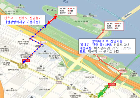 한강공원 양화지구에서 공원까지의 도보코스는 이용 불가