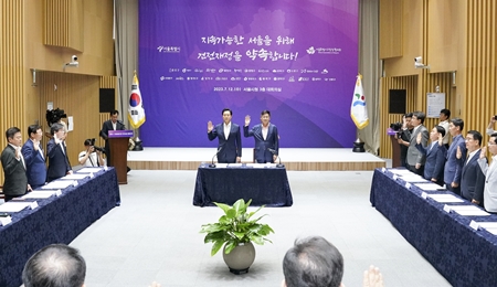 서울시 구청장협의회와 오세훈 시장은 12일 서울시청에서 발표한 시‧구 공동선언문에서 “경기침체와 부동산 시장 악화에 따른 세수결손, 저출생‧고령화 가속화에 따른 세출 증가 등 재정 위기 상황에 대해 공감대를 형성하고 선제적으로 대응하기로 했다.