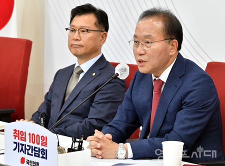 국민의힘 윤재옥 원내대표(사진 오른쪽)는 “원내대표에 취임하면서 가장 중요하게 말씀드린 것이 ‘의회정치 복원’이었는데 사실상 나아진 게 없는 것 같아서 부끄럽고 답답한 심정이다”라고 밝혔다. 윤재옥 원내대표는 7월 14일 국회에서 원내대표 취임 100일 기자간담회 모두 발언에서 “기자간담회를 준비하면서 지난 100일 동안 국회는 어떤 일이 있었는지, 여러분들께서 쓰신 기사들을 쭉 한 번 훑어봤다. 아무리 찾아봐도 좋은 기사는 거의 없고 ‘국회의원 월급 깎아라’, ‘국회 해산해라’ 이런 댓글들이 수백 개씩 달린 기사들이 참 많았다”라며 이같이 밝혔다. 윤재옥 원내대표는 “이제부터라도 우리 국회가 조금이나마 제자리로 돌아오기를 바라는 마음 간절하다”라며 “지금 우리 국민들의 형편이 얼마나 어려운가. 경제지표들이 조금씩 나아지고 있기는 하지만, 현장의 기업들이 겪는 어려움은 여전하고 특히 서민경제는 고통이 더 큰 상황이다”라고 강조했다. 윤재옥 원내대표는 “북한은 핵 개발과 미사일 발사를 멈추지 않고 있고 미중 갈등 심화, 우크라이나 전쟁 등 글로벌 외교환경도 우리의 미래에 심각한 위협이 되고 있다”라며 “국회가 정쟁의 틀에 갇혀서 제때, 제대로 일을 하지 못하면 온 국민이 힘들어지고 나라의 미래도 어두워질 수밖에 없다”라고 밝혔다. 윤재옥 원내대표는 “이제 21대 국회도 임기가 10개월 정도밖에 남지 않았고 실질적으로 일할 수 있는 시간은 반년 남짓인데 마지막까지 국민들을 실망시켜서는 안 된다고 생각한다”라며 “사실상 21대 국회의 종착역인 이번 9월 정기국회를 잘 마무리해서 국민의 기대에 부응해야만 한다”라고 강조했다. 윤재옥 원내대표는 “선거를 앞둔 상황이라 협상 환경이 좋지는 않겠지만, 선거법, 내년 예산 등 첨예한 과제들을 원만하게 풀어내고 시급한 민생법안들을 신속하게 처리할 수 있도록 여당 원내대표로서 할 수 있는 노력을 다할 생각이다”라고 밝혔다.