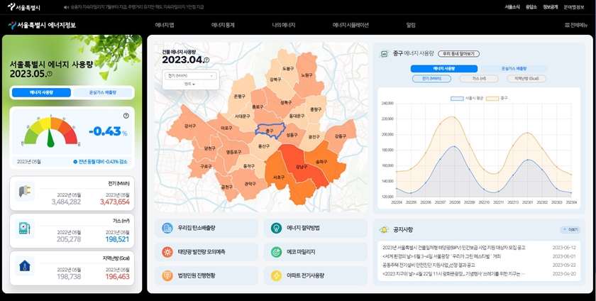 서울시가 에너지(전기, 가스, 열) 사용량과 온실가스 배출량 현황 등 에너지 통계정보를 한 곳에서 확인할 수 있는 ‘서울시 에너지정보 누리집’을 이달부터 운영한다. 에너지원 데이터는 국토교통부 산하 한국부동산원에서 제공하며, 자료 수급·검수와 가공으로 인해 3개월 전 데이터를 표출한다.