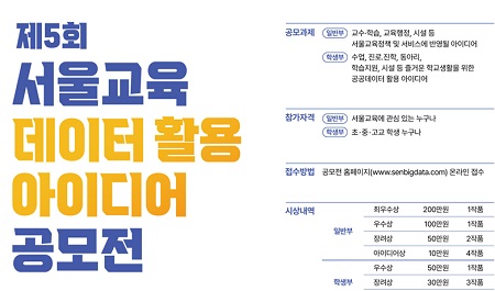 서울특별시교육청(교육감 조희연)은 서울교육 정책과 서비스에 반영될 아이디어’와 즐거운 학교생활을 위한 공공데이터 활용’을 주제로 ‘서울교육 데이터 활용 아이디어 공모전’을 개최한다.