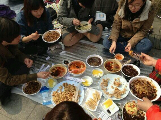 3월 8일(금) 오후 쌍용자동차 분향소 철거 소식을 듣고 대한문 앞으로 달려온 시민들, 행인들이 시켜준 중국음식으로 점심을 해결하고 있다.