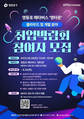 영등포구(구청장 최호권)가 4차 산업혁명 시대를 대비해 첨단 디지털 분야 취업을 희망하는 청년 구직자를 위해 26일, ‘메타버스(3차원 가상세계) 취업박람회’를 개최한다고 밝혔다. 취업박람회는 8월 26일 오후 1시부터 6시까지 영등포 청년 메타버스 플랫폼인 ‘영타운’에서 개최된다. ‘메타버스 취업박람회’는 청년정책 홍보를 시작으로 ▲인터넷 기반 정보 통신 자원 통합·공유 서비스(클라우드) 및 개발 등 디지털 분야 현직자들의 직무 설명회와 기업 소개 ▲삼성전자 인사팀 출신이자 ‘내일부터 출근’의 유튜버 ‘젤리 멘토’의 전략적인 자기소개서 작성 방법과 면접 특강 ▲청년센터 ‘영등포 오랑’의 보물찾기 등 다양한 이벤트가 펼쳐진다. 특히 직무 설명회는 디지털 분야에 종사하는 현직자가 직접 강의를 맡아 취업 성공을 위한 생생한 직무 설명, 관련 업계의 전망과 합격 전략, 채용 대세(트렌드) 등을 전달한다. 19세 이상 39세 이하 미취업 청년이라면 누구나 참여할 수 있으며, 포스터 내 정보무늬(QR코드)를 통해 접속해 신청서를 제출하면 된다. 박상준 일자리정책과장은 “이번 취업박람회를 통해 최근 떠오르는 디지털 분야 취업을 희망하는 청년들이 일자리를 찾고, 다양한 정보도 얻기를 바란다”라며 “앞으로도 청년들의 눈높이에 맞는 일자리 정보를 제공하고, 취업까지 성공할 수 있도록 적극 지원해 나가겠다”라고 전했다