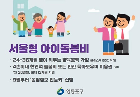 최근 부모가 직접 아이를 돌보기 어려운 양육 공백 가정이 늘어나고 있는 가운데, 영등포구가 24~36개월 영아 가정(중위 150% 아래)에 ‘서울형 아이 돌봄비’를 지원 사업을 본격적으로 추진한다.
