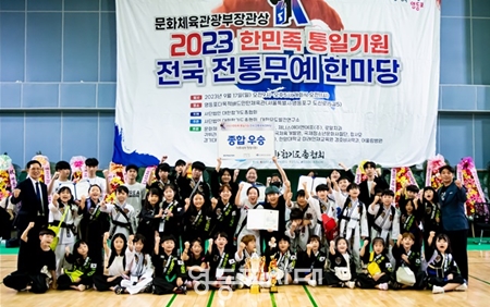 ‘2023 한민족 통일기원 전국 전통 무예 한마당’을 개최해 성공적으로 마무리한 황용의 대한합기도총협회 회장의 일성이다. 사단법인 대한합기도총협회는 9월 17일 서울 영등포 다목적 배드민턴 체육관에서 ‘2023 한민족 통일 기원 전국 전통 무예 한마당’(아래 전통 무예 한마당)을 개최했다. 이날 개최한 전통 무예 한마당에서는 경기도 두산합기도 (임용성 관장)가 종합우승을 차지해 문화체육관광부 장관상을 받는 쾌거를 이뤘다. 이어 준우승은 정무합기도 (한길용 관장)이 3위는 양우관 청학종합체육관(이선우 관장)이 차지했다. 이날 개최된 전통 무예 한마당에서는 경기도 두산합기도 (임용성 관장)이 종합우승을 차지해 문화체육관광부 장관상을 받는 쾌거를 이뤘다. 이어 정무합기도 (한길용 관장)이 준우승, 양우관 청학종합체육관(이선우 관장)이 3위를 차지했다. 또한 낙법과 발차기 부문에서 진행된 왕중왕전 초등부에서는 흑추관정무도장 소속의 조예찬 선수(경원초)가 2관왕을 차지했다. 중등부에서는 각각 이지율(대한격투합기도, 광혜원중), 이세민(용인대 화랑합기도, 서전중) 선수가 고대일반부에서는 오준원(천지관어은도장, 중일고), 최홍민(용인대 화랑합기도, 동성고) 선수가 우승을 차지했다. 종합단체연무 부분에서는 흑추관정무도장이 우승을, 활인합기도가 준우승, 충의체육관이 3위를 차지했다. 이에 앞서 열린 대회 개회식에는 대회장인 김민석 국회의원, 정선희 영등포구의회 의장, 전) 합기도통합단체 박영대 회장, 대한무도학회 김창우 회장, K-타이거즈 안학선 단장 등 많은 내외빈이 함께했다. ‘한민족 통일기원 전국 전통 무예 한마당’ 대회는 낙법, 발차기, 호신술, 격파, 품새, 종합단체 연무 등 총 9가지 종목에서 경합을 벌인 종합 무예 대회로, 8년째 명맥을 이어오고 있는 전통 깊은 무예 대회다. 올해에는 10명 이상이 참가하는 도장을 대상으로 경쟁하는 종합시상 부문 1위 팀에 ‘문화체육관광부 장관상’ 수상이라는 혜택이 새롭게 추가되었다. 무도 통합단체 소속 수련생이라면 누구나 참가할 수 있었던 이번 대회에는 무도 수련생을 포함하여 관계자, 학부모 등 총 1,200여 명이 참가해 높은 관심 속에 대회가 진행됐다. 황용의 회장은 “올해 ‘문화체육관광부 장관상’을 신설을 통해 많은 선수가 이번 대회를 기다렸다는 것을 듣고 상당히 기뻤다”라며 “내년에도 청소년들을 위한 꿈의 무대를 만들어줄 수 있도록 대한합기도총협회에서도 노력하겠다”고 밝혔다. 황용의 회장은 특별히 올해 ‘문화체육관광부 장관상’을 신설해 준 문화체육관광부에 특별히 감사의 인사를 전했다.