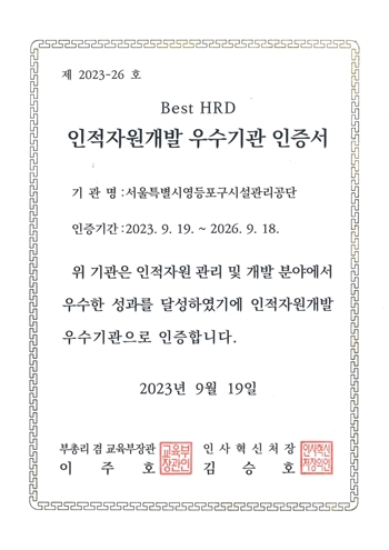 ‘인적자원개발 우수기관 인증’ 제도는 능력 중심 인재 채용, 역량 기반 인사관리 기획 및 재직자 교육훈련 기획 확대 등 인적자원개발에 모범이 되는 기관을 인증하는 제도이다. 인적자원개발 우수기관으로 인증된 공공기관은 역량 있는 인재 채용 등 대외적인 홍보에 인증 기호(Best HRD)를 활용할 수 있고, 3년간 고용노동부의 정기근로감독 면제 등 다양한 혜택이 주어진다. 오인영 이사장은 “이번 인증 획득에 만족하지 않고, 지속해서 정부 정책 준수 직무 중심의 인사제도 운용 및 직무 중심의 능력 개발을 통해 직원들의 전문성을 향상해, 주민이 만족할 수 있는 공공서비스 제공에 최선의 노력을 다하겠다”라고 밝혔다. 영등포구시설관리공단은 교육부로부터 9월 19일 인적자원개발 우수기관으로 인증서를 받았다.