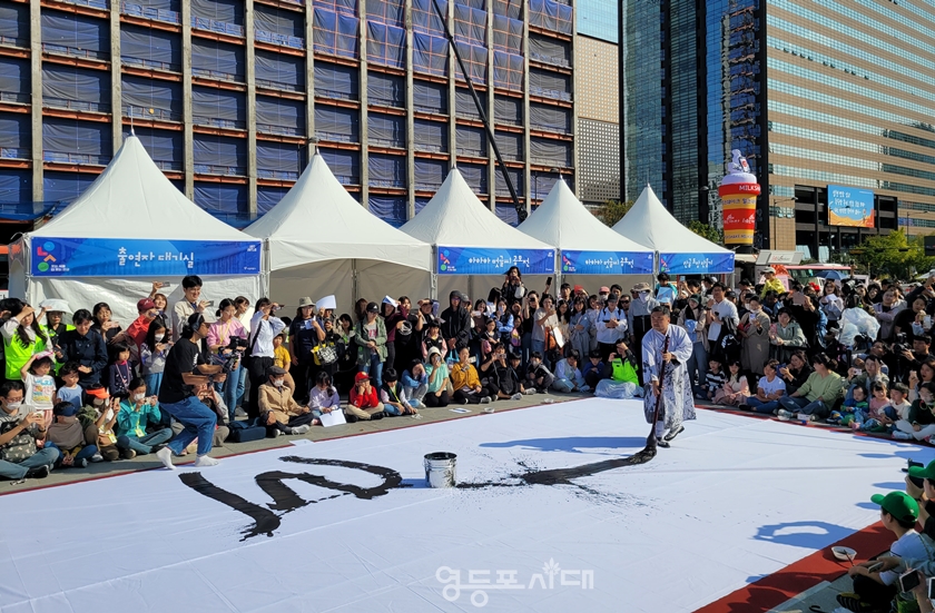 이날 이상현 작가의 퍼포먼스가 끝난 후 시민들이 직접 붓을 잡고 한글을 쓰는 이벤트를 진행해 눈길을 끌었다.