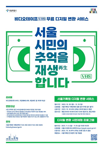 서울기록원은 보고 싶어도 볼 수 없었던 비디오테이프를 디지털화하여 세상 밖으로 꺼내어 볼 수 있는 행사가 열린다. 서울기록원은 서울시민의 추억을 디지털로 변환하는 체험행사인 ‘서울시민의 추억을 재생(再生)합니다’를 오는 11월 6일부터 10일까지 5일간 서울기록원에서 개최한다. 예약은 공공서비스예약(https://yeyak.seoul.go.kr)에서 접수할 수 있으며, 체험 비용은 무료이다. 서울에 거주하는 시민이면 누구나 참여할 수 있다. 단, 1인당 2개까지만 가능하고 선착순 1일 4명, 5일간 총 20명만 직접 체험할 수 있다. 또한, 서울기록원에서 직접 시민들의 아날로그 비디오테이프를 디지털 파일로 변환해 주는 서비스도 함께 운영한다. 이 행사는 직접 디지털 변환 체험이 어려운 시민을 대상으로 진행하며 신청 기간은 오는 10월 30일(월)부터 선착순으로 200개(1인당 2개까지 가능) 접수 시 종료된다. 접수 시간은 평일 9시부터 16시까지(12시~13시 점심시간, 휴일 제외)이며, 서울기록원으로 방문 접수만 가능하다. 이번 행사 프로그램에 대한 자세한 내용은 서울기록원 홈페이지에서 확인하거나 서울기록원 기록정책과(02-350-5612)로 문의하면 된다. 고경희 서울기록원장은 “결혼식, 돌잔치 등 시민들의 추억이 담긴 비디오테이프를 재생할 수 있는 장비가 없어서 집 어딘가에 방치된 경우를 많이 봤다”라고 밝혔다. 고 원장은 “시민들의 옛 추억 영상들을 디지털로 변환하여 평생 소장할 수 있도록 이번 행사를 준비하였다”라며 “시민들의 많은 관심과 참여를 바란다”라고 덧붙였다.