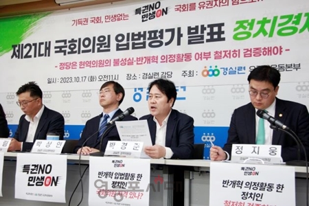경실련 유권자운동본부는 2023년 10월 17일, 경실련 강당에서 기자회견을 열고 5,370개의 정치·경제 분야 제21대 국회의원에 대한 입법 평가 결과’를 발표했다. 경제 분야에서는 이용우 의원(민주당/경기 고양시정)이 가장 높은 180점을 받았다. 이어 박용진 의원(민주당/서울 강북구을)이 93점, 양정숙 의원(무소속/비례대표)이 82점 순으로 그 뒤를 이었다. 세 의원은 ▲재벌경제력 집중 억제, ▲금융소비자 보호, ▲자본시장 불공정 근절 등 다수의 개혁적 법안을 대표 발의하여 개혁 입법 점수가 높게 나타났다. 한편, 추경호 의원(국민의힘/대구 달성군) 50점, 김병욱 의원(민주당/경기 성남시 분당구을) 49점, 송언석 의원(국민의힘/경북 김천시) 33점 등이 ▲재벌의 경제력 집중 억제, ▲조세 정의, ▲금융소비자 보호 등에 반하는 반개혁적 법안을 다수 대표 발의하여 반개혁 입법 점수가 높게 나타났다. 정치 분야에서는 민형배 의원민주당/광주 광산구을) 92점, 이탄희 의원(민주당/경기 용인시정) 47점, 이은주 의원(정의당/비례대표) 42점 순으로 나타났다. 세 의원은 ▲국회의원 선거제도 비례성 확대, ▲위성정당 방지, ▲비례대표 공천 투명성 강화, ▲지역정당 설립 요건 완화, ▲정치자금 지출 내용 공개, ▲국고보조금 배분 방식 개선, ▲고위공직자 재산축소 신고 방지, ▲주식백지신탁 심사 결과 공개, ▲대법원 다양성 및 대법관 수 증원, ▲판결문 공개 확대, ▲국민참여재판제도 확대 등의 내용을 담은 개혁적 법안을 다수 발의하여 개혁 입법 점수가 높게 나타났다. 다만 정치 분야에서는 2건 이상 중점 반개혁 법안을 발의한 의원이 없는 것으로 나타났다. 경실련은 “이러한 후보자 자질검증과 입법 평가 등을 통해 각 정당에 현역 의원에 대한 불성실 의정활동, 반개혁적 의정활동 여부를 철저히 검증할 것”을 촉구했다. 경실련은 “이번에 발표한 내용은 중간 평가의 성격이며, 경실련은 향후 정기국회를 포함해 연말까지 입법 실적을 반영하여 최종 총선 후보 공천에서 배제되어야 할 후보를 선정할 예정이다”라고 밝혔다. 경실련에 따르면 평가 기간은 3년 2개월(2019.05.01.~2023.07.07.)이며, 평가 대상은 평가 기간 국회에 발의된 법안 중 경실련 주요 활동 분야 법안으로, 정치·경제 분야는 평가 대상 13,371개(경제 8,088개, 정치 5,283개) 법안 중 5,370개(경제 3,962개, 정치 1,408개)이다. 평가는 경실련 개혁 과제 기준으로 내외 전문가들이 참여하여 ‘개혁’이면 1점, ‘반개혁’이면 –1점, ‘중립’이면 0점 부여하고, 개혁 또는 반개혁 가치가 두드러진 법안에는 가중 점수 10점을 부여한 후, 의원별 대표 발의 법안의 개혁과 반개혁 점수를 각각 산출하는 방식으로 진행되었다. 경실련은 10월 19일 오전 11시에는 부동산 및 건설, 복지 및 소비자 분야 입법 평가 결과를 발표할 예정이다.