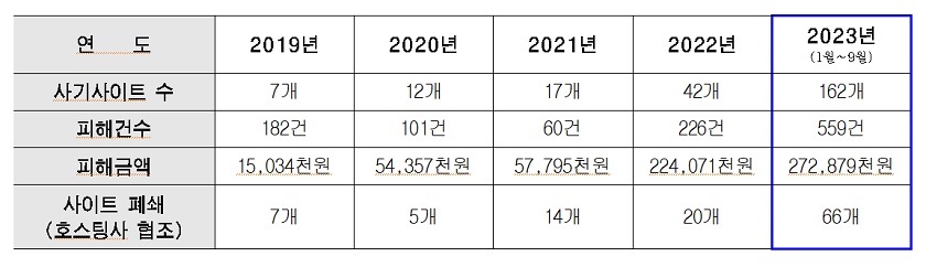 서울시에 따르면 올해 1~9월 ‘서울시 전자상거래센터’에 신고된 사기 피해 사이트 수는 총 162개로, 전년보다 4배 증가한 것으로 나타났다. 이런 수치는 2019년부터 2022년까지 4년간 접수된 사기 사이트 건수 총 78건보다 두 배나 많은 수치다.