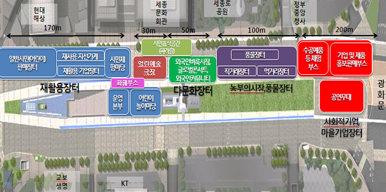 세종로 보행전용거리와 광화문광장 총 1만1,000㎡에 도심 최대 이색장터가 열린다. 이 공간은 재활용 물품 판매, 재능기부 등 시민이 직접 운영하고 소비하는 ‘시민들의 공간’으로 꾸려진다.