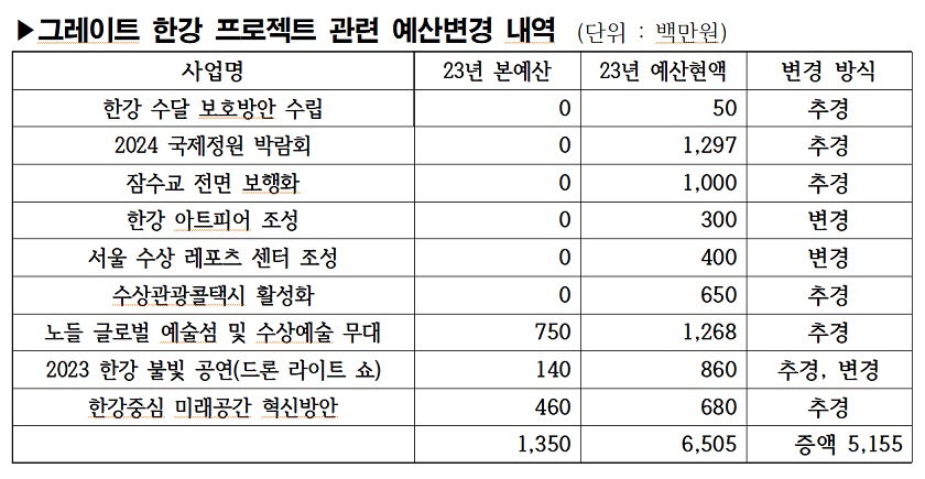 미래한강본부가 강동길 시의원에게 제출한 ‘그레이트 한강(한강르네상스2.0) 프로젝트’ 추진계획과 55개 선도 사업 추진계획에 따르면 이같이 나타났다. 특히 그레이트 한강 프로젝트에는 연차별로 2022년 이전 520억원, 2023년 802억원, 2024년 1,282억원, 2025년 2,901억원, 2026년 이후 5,870억원의 재정이 투입된다. 이 중 올해 예산은 공사비 증액분을 반영하기 위한 추경, 전년도 이월 예산 등을 제외하더라도 “2024 국제정원 박람회” 12억 9천7백만원, 잠수교 전면 보행화 10억원, “수상 관광 콜택시 활성화” 6억 5천만원 등 추경과 변경 사용을 통해 50여억원을 증액했다. 이와 관련해 서울시의회 강동길 의원은 “오세훈 시장이 1, 2기 재임 기간에 사업 타당성이 부족해 좌초하거나 감사원 등으로부터 문제점을 지적받았던 사업들을 예산 운용의 원칙과 행정절차조차 무시한 채 다시 밀어붙이고 있다”라고 비판하고 나섰다.