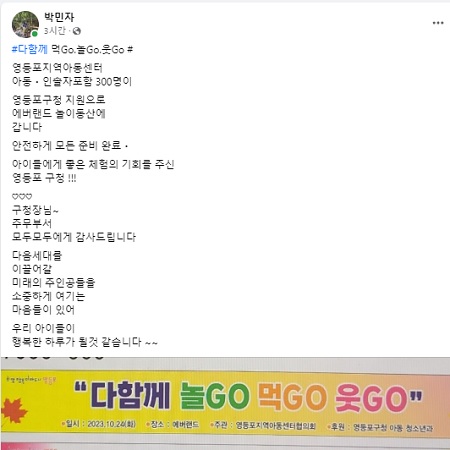 영등포구청 지원으로 이루어진 이번 삼고 체험활동은 ‘다 함께 먹Go.놀Go.웃Go’라는 슬로건 아래 진행된다. 박민자 선유사회적협동조합(선유지역아동센터) 센터장은 10월 24일 오전 자신의 페이스북에 “안전하게 모든 준비 완료했다”라며 “아이들에게 좋은 체험의 기회를 준 영등포구청장과 구청 관계자들에게 감사드린다”라고 올렸다. 박 센터장은 이어 “다음 세대를 이끌어갈 미래의 주인공들을 소중하게 여기는 마음들이 있어 우리 아이들이 행복한 하루가 될것 같다”라고 덧붙였다.