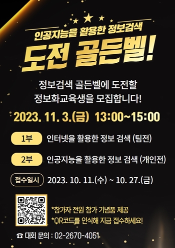 영등포구(구청장 최호권)가 “11월 3일, YPD 미래평생학습관에서 구민 정보화 역량 및 능력 제고를 위해 ‘도전! 정보검색 골든벨’ 대회 개최한다”고 밝혔다. 이번 대회는 전 세계적으로 챗 GPT 등 인공지능 열풍이 거센 가운데 구민들이 다양한 검색 서비스를 활용해 정보검색 능력을 마음껏 뽐낼 수 있는 자리로 마련됐다. 영등포구는 이번 대회를 통해 방대한 양의 정보 속에서 자신이 원하는 정보와 필요한 검색 경로가 무엇인지 정확하게 파악하고, 문제를 신속하게 해결할 수 있는 능력을 높인다는 계획이다. 올해 처음으로 열리는 ‘도전! 정보검색 골든벨’은 11월 3일, 오후 1시 대림동에 있는 평생학습관에서 진행되며 참여를 신청한 구민 50명이 참여한다. 대회는 1부 ‘인터넷을 활용한 정보검색’과 2부 ‘인공지능을 활용한 정보검색’으로 진행된다. 1부는 5명이 한 팀이 되어 준비된 노트북과 각자의 스마트폰으로 검색 포털과 인공지능 검색 서비스를 통해 문제를 검색하고, 정확한 답안을 가장 빨리 발표하면 된다. 팀은 랜덤으로 배정되며 10개 팀 중 상위 2개 팀이 2부에 진출한다. 2부는 1부에서 진출한 2개팀, 총 10명의 참가자가 최후의 1인을 가리는 개별전을 펼친다. 10명의 참가자들은 챗 GTP, YouChat 등 인공지능 검색 서비스를 활용해 문제를 풀고, 정답을 화이트보드에 적어내는 서바이벌 퀴즈 형식으로 진행된다. 1차에서 탈락한 참여자를 위한 이벤트와 레크리에이션도 마련되어 있다. 참여를 희망하는 구민은 27일까지 구 홈페이지 내 통합예약 메뉴에서 신청하면 된다. 지역, 연령 제한 없이 구민이라면 누구나 참여할 수 있다. 아울러 구는 올 한 해 진행한 ‘정보화 교육’에 참여한 수강생들의 작품을 공유하는 ‘정보화 교육 작품전시회’도 같은 날 YDP미래평생학습관 1층에서 개최한다. 구는 영상 편집본, 디자인 툴을 활용해 꾸민 사진 등을 태블릿, PC로 선보이며 수준 높은 ‘정보화 교육’의 면모를 보여줄 예정이다. 최호권 영등포구청장은 “앞으로도 대화 로봇(챗봇), 챗 GPT 등 급변하는 정보기술(IT) 시대에 소외되는 구민들이 없도록 시대 흐름에 맞춘 다양한 정보화 교육을 펼치겠다”라고 전했다.