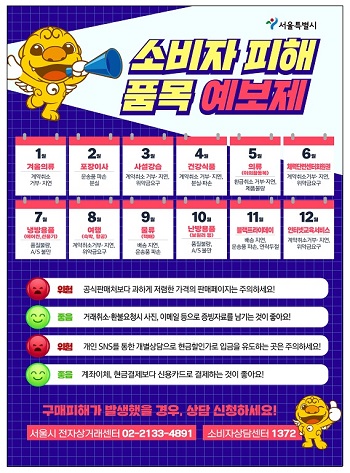 지난 4년간 한국소비자원에 접수된 피해상담 빅데이터 57만여 건을 분석, 시기별 소비자피해예보 품목을 정하고 있으며 매달 상세한 피해 유형과 예방법을 안내해 오고 있는 서울시가 해외직구, 구매대행 관련 피해 예보제 발령한다.