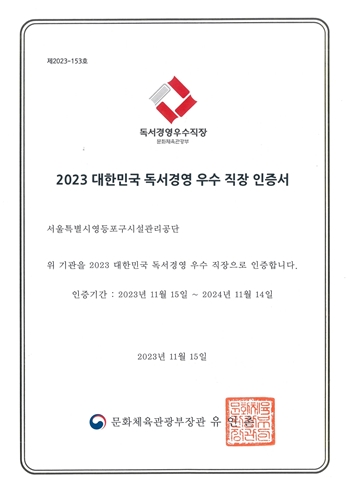영등포구 시설관리공단(이사장)이 직장 내 독서환경을 조성하고 조직과 개인의 소통 및 창의력 증진 등에 성과를 거두고 있는 기관에 인증을 부여하는 ‘독서경영 우수직장 인증’을 획득했다.
