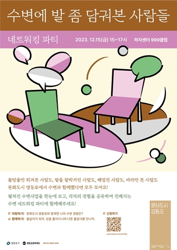 영등포문화재단이 문화도시 영등포 수변의 연대를 확장하기 위한 개최하는 네트워킹 파티의 이름이다. 영등포문화재단(대표이사 이건왕) 12월 15일 오후 3시, 서울 영등포구 하자센터에서 ‘수변에 발 좀 담가본 사람들’의 행사를 개최한다. 행사는 1부 결과공유, 2부 네트워킹으로 진행된다. 1부 결과공유를 통해, 참여 시민이 직접 소개하는 ‘탐구생활 안양천’, ‘#수변에서 #OO한 #실험하기’ 사업의 생생한 이야기와 ‘시민 축제 기획단 스쿨’과 ‘수변 브랜딩 스쿨’의 진행 방향을 살펴볼 수 있다. 2부 네트워킹에서는 참여했던 수변 사업의 추억과 후기를 공유하는 ‘물살이 파티’를 진행한다. 선호하는 수변과 즐거웠던 사업의 후기를 공유하며, 참가자들이 자유롭게 네트워킹하는 시간이 마련돼 있다. 참여 방법은 영등포문화재단 홈페이지 내 신청폼으로 접수하면 된다. 이날 행사에서는 문화도시 영등포의 시민 참여 사업인 ‘수변문화탐구생활’의 결과물과 시민 공감 브랜드를 구축하는 ‘도시수변 통합브랜딩’의 진행 과정을 공유한다. ‘수변문화탐구생활’의 SNS 챌린지는 문화도시 영등포 인스타그램을 통해 수변 중심 시민 행동양식을 발굴하는 해시태그 챌린지로 운영해 1500여명이 참여했다. 챌린지를 통해 시민이 가장 많이 즐긴 영등포 수변 행동 Top3와 행동 밀집 지역을 확인할 수 있다. 아울러 ‘도시수변 통합브랜딩’으로 진행될 사업을 소개하는 자리가 마련된다. 12월부터 1월까지 진행되는 다양한 연령층의 시민이 함께 그려보는 시민스쿨 프로젝트로 ‘시민 축제기획단 스쿨’, ‘어린이 브랜딩 스쿨’, ‘어린이 축제 공간디자인 스쿨’의 계획을 접할 수 있다. 영등포문화재단은 영등포구가 ‘법정문화도시’로 지정됨에 따라, 영등포 문화도시 조성사업을 추진하고 있다. 이건왕 영등포문화재단 대표이사는 “보다 많은 시민이 영등포 수변을 중심으로 소통하길 바란다”며 “이번 네트워킹 파티를 통해 수변 민관 거버넌스 확장을 위해 노력하겠다”고 말했다.