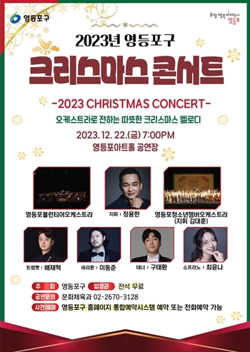 영등포구가 클래식, 캐럴 멜로디뿐만 아니라 유명 오페라 아리아, 영화 주제곡, 가곡까지 다채로운 장르를 선보이는 ‘크리스마스 콘서트’를 개최한다. 전 좌석은 무료이며, 구 누리집 통합예약 시스템을 통해 예약할 수 있다.
