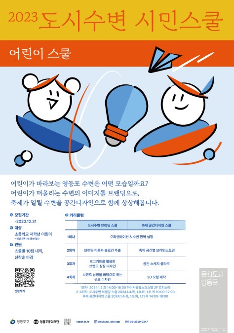 영등포문화재단(대표이사 이건왕)이 “2024년 1월 2일부터 11일까지 ‘2023 도시수변 시민스쿨 어린이 스쿨’에 참여할 어린이를 모집한다”라고 12월 28일 밝혔다.