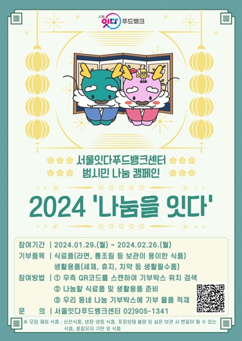 서울시가 설 명절을 맞이하여 1월 29일(월)부터 다음 달 26일(월)까지 ‘서울잇다푸드뱅크센터’와 설맞이 범시민 식품 나눔 캠페인 ‘나눔을 잇다’를 진행한다.