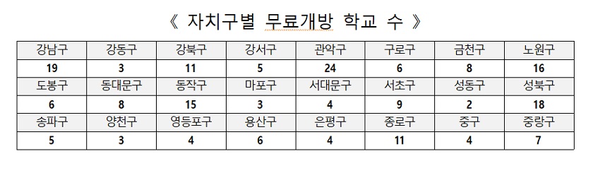 학교 주차장과 운동장 무료 개방, 주차 불편 해소 서울특별시교육청은 “설 연휴 기간인 2월 9일부터 2월 12일까지 4일간 서울특별시교육청 지역 내 공·사립 각급 학교 총 201교의 주차장을 무료 개방한다”라고 2월 5일 밝혔다.