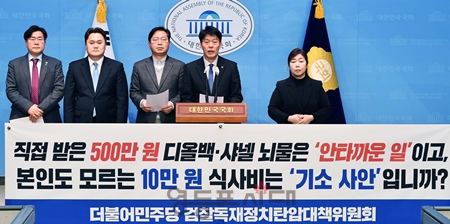 이와 관련해 민주당 검찰독재정치탄압대책위원회는 김건희 여사 특검법에 대한 거부권을 행사한 윤석열 대통령과 김건희 여사의 디올백 수수에 관한 수사를 진행하지 않고 있는 검찰을 강하게 비판했다. 민주당 검찰독재정치탄압대책위원회(아래 대책위원회)는 2월 16일 국회 소통관에서 기자회견을 열고 “윤석열 정권과 국민의힘이 김건희 여사의 디올백 논란에서 도저히 빠져나오기 힘든지, 다시 검찰을 동원해, 뻔한 공작을 벌이기 시작했다”라며 “직접 받은 500만 원 디올백·샤넬 뇌물은 ‘아쉬운 일’이고, 본인도 모르는 10만 원 식사비는 ‘기소 사안’입니까?”라고 따져 물으며 이같이 비판했다. 대책위원회는 “혐의 내용은 황당하기 그지없다. 김혜경 씨가 2021년 8월 민주당 국회의원 배우자 등 6명에게 10만 4,000원 상당의 식사비를 제공했다는 것이, 선거법 위반 사유다”라며 “당시 김혜경 씨는 선거 카드로 식비 중 본인의 몫인 26,000원만을 결제했고, 나머지 78,000원은 직원이 김혜경 씨 모르게 법인카드로 결제했다는 김혜경 씨의 입장은 아예 고려조차 되지 않았다”라고 주장했다. 대책위원회는 “윤석열 정권과 검찰은 정작 수사하고 기소해야 할 김건희 여사가 직접 받은 디올백에 대한 뇌물 수수 등의 혐의는 어물쩍 넘어가면서, 이재명 대표 배우자 김혜경 씨에 대해서는, 본인도 모르는 사안의 꼬투리를 잡아 침소봉대하면서 여론몰이하고 있다”라고 거듭 주장했다. 대책위원회는 “윤석열 대통령은 후보 시절부터 지속해서 법과 원칙의 중요성을 강조해 왔다. 하지만, 본인의 배우자에게는 이 나라의 어떠한 법과 원칙도 적용되지 않고 있습니다. ‘아쉽다’라는 말 한마디로 끝이다”라면서 “이제는 윤석열 대통령이 법을 적용·집행하던 ‘법조인’ 출신이 과연 맞는지조차 의심스러운 지경이다”라고 목소리를 높였다. 대책위원회는 “괴롭히기식의 야당 대표 부부에 대한 불합리한 수사와 기소, 그리고 그와 상반되는 김건희 여사에 대한 몰염치한 감싸기는 현 정부와 검찰이 얼마나 무도하고 불공정하며, 또 도덕적으로 저열한지만 보여줄 뿐이다”라며 “민주당 검찰독재정치탄압대책위원회는 윤석열 정권과 검찰이 국민의 원하는 제 역할을 할 때까지, 끝까지 진실을 밝혀나가겠다”라고 밝혔다.