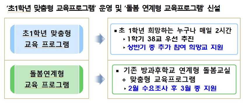 서울시교육청은 ‘초1 맞춤형 교육프로그램’ 외에 ‘돌봄연계형 교육프로그램’을 추가로 운영할 계획이다. 기존의 방과후학교 연계형 돌봄과 방과후학교 프로그램을 결합하여 2시간의 무료방과후 프로그램과 1시간의 추가 돌봄을 제공할 예정으로, 2월 중 수요조사를 시행한 후 희망교를 대상으로 3월중 운영을 시작할 계획이다.