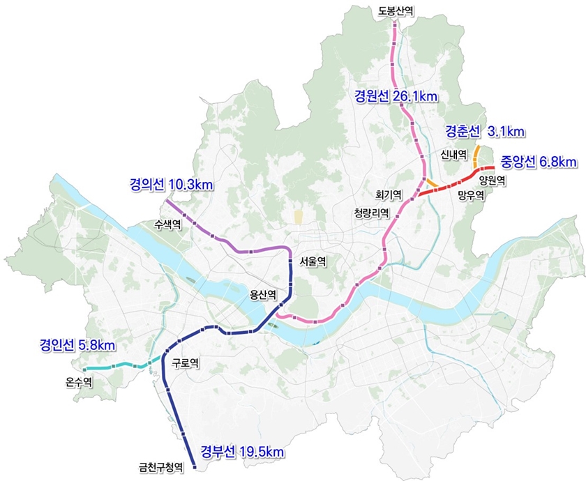 서울시 내 국가철도 지상 구간은 총 71.6km로 경부·경인·경의·경원·경춘·중앙선 등 6개 노선과 도시철도 29.6km 4개 노선(2호선·3호선·4호선·7호선)이 포함되어 있다. 서울시가 지역단절과 도시 활력 저해 요인으로 꼽히던 지상철도 구간을 지하화하는 특별법이 제정됨에 따라, 지상철도 지하화 및 철도부지 상부 활용․개발을 위한 선제적인 준비 작업에 나섰다. 서울시는 정부의 ‘철도지하화 및 철도부지 통합개발에 관한 특별법(아래 철도지하화 특별법)’ 제정에 맞춰 지상철도 상부에 대한 도시공간구상 및 개발방안을 수립하는 내용을 골자로 한 기본구상 용역을 3월 중 발주한다고 밝혔다. 서울시는 용역을 통한 구상안을 국토부에 제안하는 등 국토부가 수립하는 종합계획에 서울시 여건이 반영될 수 있도록 철도 지하화 실현방안을 발 빠르게 마련하겠다는 방침이다.