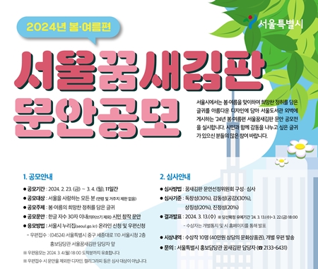 싱그러운 봄‧여름을 앞두고 ‘봄·여름 희망찬 정취를 담은 글귀’를 주제로 한 ‘서울꿈새김판 문안 공모’를 진행한다. ‘서울꿈새김판’은 각박한 일상 속 시민에게 위로와 희망의 메시지를 전하고 시민의 삶 속에서 공감하는 메시지를 나누기 위해 지난 2013년 6월, 서울도서관 정면 외벽에 설치한 대형 글판이다. 서울꿈새김판 공모는 거주지역과 나이에 상관없이 서울을 사랑하는 사람이면 누구나 참여할 수 있으며 한글 30글자 이내의 창작 문안을 1인당 3개 작품까지 응모할 수 있다. 각각의 작품은 개별 접수해야 한다. 출품작은 내외부 위원으로 구성된 ‘문안선정위원회’에서 심사를 거쳐 최종 10개의 작품이 선정되며, 각 수상자에게는 40만 원 상당의 문화상품권이 지급된다. 서울시는 수상작을 디자인하여 봄편 꿈새김판과 여름편 꿈새김판 등에 게시하고 다양한 서울시 홍보 매체를 통해 시민들에게 감동을 선사하고 소통할 예정이다.