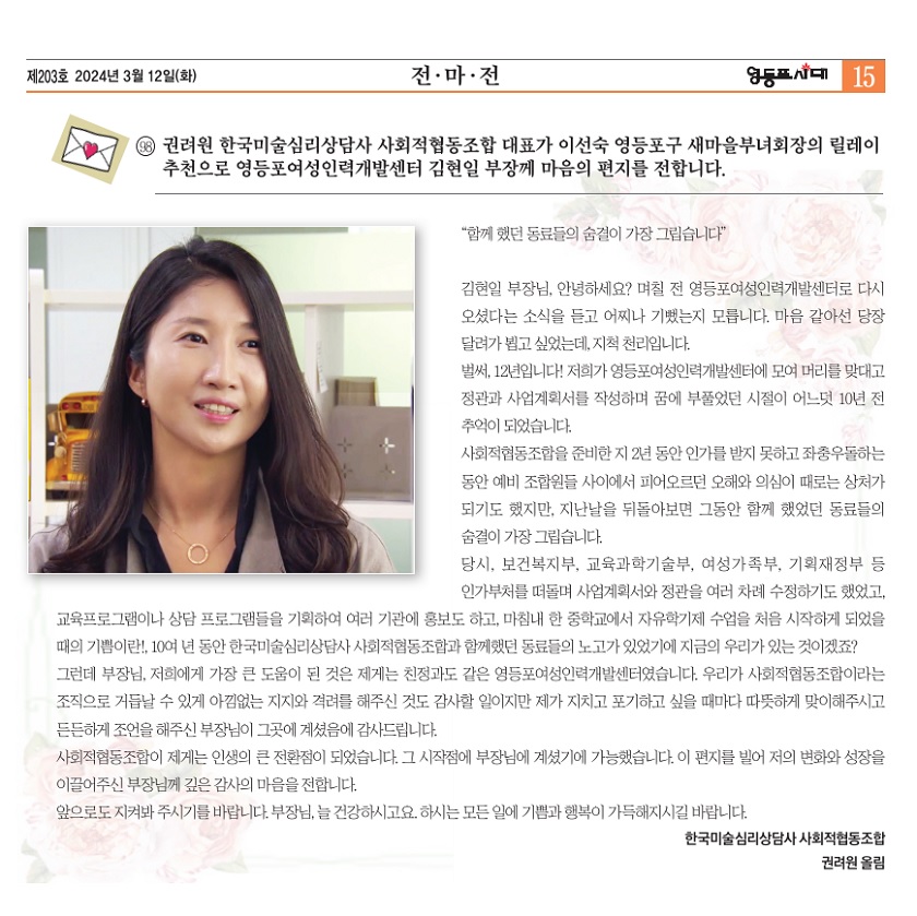 권려원 한국미술심리상담사 사회적협동조합 대표가 이선숙 영등포구 새마을부녀회장의 릴레이 추천으로 영등포여성인력개발센터 김현일 부장께 마음의 편지를 전합니다.