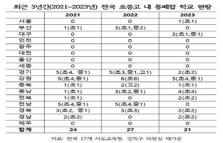 최근 3년간 통폐합한 학교 72개교(2021년 24개교, 2022년 27개교, 2023년 21개교) 중 초등학교가 58개교로 가장 높은 비중을 차지한 것으로 나타났다.