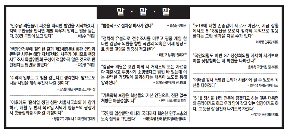 -이성수 구의원 “행정안전부에 질의한 결과 제2세종문화회관 건립과 관련한 사무는 해당 자치단체의 사무가 아니므로 행정사무조사 특별위원회 구성이 적절하지 않은 것으로 판단된다는 답변을 받았다” -차인영 구의원 “법률적으로 절차상 하자가 없다” -유승용 구의원 “수익의 일부로 그 빚을 갚는다고 생각한다. 앞으로도 나눔 사업을 계속 추진해 나갈 것이다” -조남형 한결새마을금고 이사장 “이후에도 ‘윤석열 정권 심판 서울시국회의’에 참가하고, 매월 두 번째 목요일 저녁에 영등포역 광장에서 촛불집회를 이어갈 예정이다” -영등포구 지역 내 21개 단체 관계자 “정치적 유불리로 전수조사를 미루고 핑퐁 게임 한다면 김남국 의원을 향한 국민의 의혹은 이제 양당으로 향할 것임을 엄중히 경고한다” -배진교 정의당 원내대표 “김남국 의원은 코인 이체 시 거래소의 모든 자료를 다 제출하고 투명하게 소명했다고 밝힌 바 있는데 이는 완벽한 거짓말에 불과하다는 내용이 보도를 통해 알려졌다” -윤재옥 국민의힘 원내대표 “5·18에 대한 존중감이 제로가 아닌가, 지금 상황에서도 5·18정신을 오로지 정략적 목적으로 활용한다는 그런 생각을 지울 수가 없다” -이재명 민주당 대표 “국민의힘도 이번 G7 정상회의를 자세히 지켜보며 이를 뒷받침하는 데 최선을 다하겠다” -윤재옥 국민의힘 원내대표 “이태원 참사 특별법 논의가 시급하게 될 수 있도록 최선을 다하겠다” -민주당 박광온 원내대표 “5·18 정신을 헌법 전문에 담겠다고 하는 것은 대통령의 공약이기도 하고 우리 당이 갖고 있는 입장이기도 하다. 그 뜻을 잘 실천해 나가도록 하겠다” -김기현 국민의힘 대표 “기초학력 보장은 학생들의 기본 인권으로, 진단 없는 처방은 어불성설이다” - 현기 서울시의회 의장 “국민의 일상뿐만 아니라 국격까지 훼손한 민주노총의 노숙 집회를 규탄한다” -국민의힘 전국 청년지방의원협의회 184호, 2023년 5월 23일 발행/배포