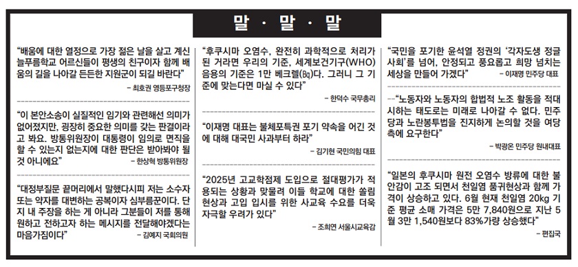-최호권 영등포구청장 “이 본안소송이 실질적인 임기와 관련해선 의미가 없어졌지만, 굉장히 중요한 의미를 갖는 판결이라고 봐요. 방통위원장이 대통령이 임의로 면직을 할 수 있는지 없는지에 대한 판단은 받아봐야 될 것 아니에요” -한상혁 방통위원장 “후쿠시마 오염수, 완전히 과학적으로 처리가 된 거라면 우리의 기준, 세계보건기구(WHO) 음용의 기준은 1만 베크렐(㏃)다. 그러니 그 기준에 맞는다면 마실 수 있다” -한덕수 국무총리 “이재명 대표는 불체포특권 포기 약속을 어긴 것에 대해 대국민 사과부터 하라” -김기현 국민의힘 대표 “국민을 포기한 윤석열 정권의 ‘각자도생 정글 사회’를 넘어, 안정되고 풍요롭고 희망 넘치는 세상을 만들어 가겠다” -이재명 민주당 대표 “대정부질문 끝머리에서 말했다시피 저는 소수자 또는 약자를 대변하는 공복이자 심부름꾼이다. 단지 내 주장을 하는 게 아니라 그분들이 저를 통해 원하고 전하고자 하는 메시지를 전달해야겠다는 마음가짐이다” -김예지 국회의원 “노동자와 노동자의 합법적 노조 활동을 적대시하는 태도로는 미래로 나아갈 수 없다. 민주당과 노란봉투법을 진지하게 논의할 것을 여당 측에 요구한다” -박광온 민주당 원내대표 “2025년 고교학점제 도입으로 절대평가가 적용되는 상황과 맞물려 이들 학교에 대한 쏠림 현상과 고입 입시를 위한 사교육 수요를 더욱 자극할 우려가 있다” -조희연 서울시교육감 “일본의 후쿠시마 원전 오염수 방류에 대한 불안감이 고조 되면서 천일염 품귀현상과 함께 가격이 상승하고 있다. 6월 현재 천일염 20kg 기준 평균 소매 가격은 5만 7,840원으로 지난 5월 3만 1,540원보다 83%가량 상승했다” 186호, 23.6.27 발행 배포