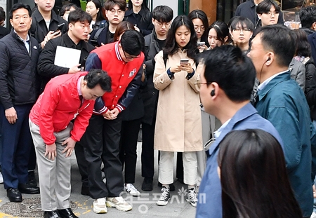 이날 아침 박용찬 후보는 한동훈 비대위원장과 나란히 서서 “반갑습니다. 국민의힘 박용찬입니다. 한동훈 비대위원장과 함께 아침 인사 올립니다”라고 허리를 숙이고 “좋은 하루되십시오”를 반복하며 지지를 호소했다.