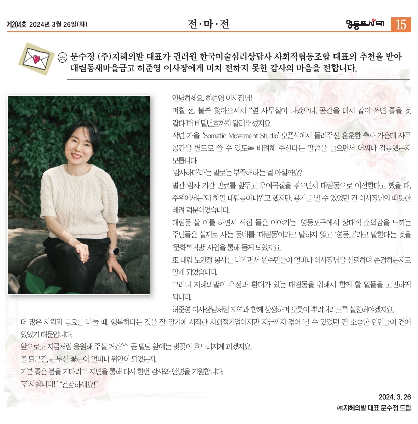 문수정 (주)지혜의밭 대표가 권려원 한국미술심리상담사 사회적협동조합 대표의 추천을 받아 대림동새마을금고 허준영 이사장에게 미처 전하지 못한 감사의 마음을 전합니다.