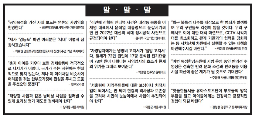 최균범(영등포시대 신문 자문위원장) “제가 ‘영등포’ 하면 여러분은 ‘시대’ 이렇게 삼창하겠습니다” -최호권 영등포구청장(영등포시대 창간 8주년 기념 축사에서) “혼자 아이를 키우다 보면 경제활동에 적극적으로 나서기가 어렵다. 국가가 주는 지원비는 현실적으로 맞지 않는다. 저나 제 아이처럼 비슷하게 어려움을 겪는 한부모가정에 관심을 두시고 도움을 주셨으면 좋겠다” -한부모가정 “김만배 신학림 인터뷰 사건은 대장동 몸통을 이재명 대표에서 윤석열 대통령으로 둔갑시키려 한 한 2022년 대선의 최대 정치공작 사건으로 규정되어야 한다” -윤재옥 국민의힘 원내대표 “자영업자에게는 냉방비 고지서가 ‘절망 고지서’다. 월세가 72만 원인데 17평 분식집 전기요금이 78만 원이 나왔다는 자영업자의 호소가 현재의 위기를 그대로 보여준다” -박광온 민주당 원내대표 “최근 불특정 다수를 대상으로 한 범죄가 발생하며 우리 구민들도 걱정이 많을 것이다. 우리 구에서도 이에 대한 대책 마련으로, CCTV 사각지대를 최소화하고 관계 기관과의 협력을 강화하는 등 자치단체 차원에서 실행할 수 있는 대책을 마련해주시길 바란다.” -정선희 영등포구의회 의장 “이번 뚝섬한강공원에 시범 운영 중인 반려견 수영장은 성숙한 반려 문화 조성과 반려동물 이용 시설 확산에 좋은 계기가 될 것으로 기대한다” -주용태 서울시 미래한강본부장 “핫둘핫둘서울 유아스포츠단이 부모들의 양육 부담을 덜고 아이들에게는 건강하고 긍정적인 경험이 되길 바란다” -김형성 영등포구 문화체육과장 “태양광 사업과 같은 낭비성 사업을 걸러낼 수 있게 효과성 평가 제도를 정비해야 한다” -장태용 서울시의원 “서울링이 지역주민들에 대한 보상이나 치적사업이 되어서는 안 되며 한강의 역사성과 보존성을 고려해 시민의 눈높이에서 사업이 추진되어야 한다” -이용균 서울시의원 191호 말말말 23. 9. 12일 발행 배포
