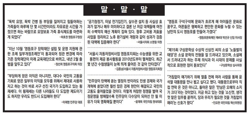 -최호권 영등포구청장 “지난 10월 ‘영등포구 장학재단 설립 및 운영 지원에 관한 조례 일부개정조례안’이 통과되어 정관 변경에 따라 기존 장학재단이 미래 교육재단으로 바뀌고, 내년 2월 출범을 앞두고 있다” -정선희 영등포구의회 의장 “부당하게 얻은 이익은 아니지만, 대다수 국민의 고통을 기회로 얻은 일부의 이익을 모두를 위해서 제대로 사용하자고 하는 것이 바로 서구 선진 국가가 도입하고 있는 횡재세다. 이 횡재세는 다른 나라들도 다 도입한 제도이기도 하지만 우리도 반드시 도입해야 한다” -이재명 민주당 대표 “공기청정기, 터널 전기집진기, 살수관 설치 등 사실상 효과가 없거나 매우 미미하다고 결론 난 저감 대책들에 여전히 수백억의 예산 계획이 잡혀 있다. 향후 고비용 저효율 사업을 정리하고 노후 환기설비 개량과 같이 성과가 검증된 대책에 집중해야 한다” -서울시의회 소영철 의원 “서울시 자동차정비사업 영등포지회는 수능생을 위한 교통편의 제공 봉사활동을 2010년도부터 펼쳐왔다. 최근 몇 년간 수험생들이 눈에 띄게 줄어든 것 같아 안타깝다” -김종남(서울시 자동차정비사업) 영등포지회장 “민주당이 탄핵에 쏟는 열정의 반이라도 민생 경제와 국가개혁에 쏟았다면 훨씬 많은 경제 현안이 해결되고 국민의 고통도 줄어들었을 것이다. 이렇게 처참한 정쟁을 벌여 국정운영을 방해할수록 민주당이 다수당이 되어선 안 될 이유가 더욱 명확해질 뿐이다” -윤재옥 국민의힘 원내대표 “영등포 구석구석에 문화가 흐르게 해 아이들은 문화로 꿈꾸고, 어른들은 행복하고 편안한 문화를 누릴 수 있는 낭만의 도시 영등포를 만들어 가겠다” -영등포문화재단 제4대 박선규 신임 이사장 “제15회 구상문학상 수상작 신상진 씨의 소설 ‘노들벌의 태양’은 소설 문학의 전형을 잘 드러내고 있으며, 소설에서 드러내고자 하는 주제 의식과 이 시대의 문제를 사실적으로 표현한 점이 돋보인다” -구상문학상 심사위원 “거침없이 얘기하기 위해 열흘 전에 여러 사람을 통해 윤석열 대통령을 만나 뵙고 싶다고 했다. 대통령으로부터 직접 연락 온 것은 아니고, 돌아온 말은 ‘만남은 오해의 소지가 크다’라는 것이었다. 지금 하고 있는 것을 '소신껏, 생각껏 맡은 임무를 끝까지, 당과 우리가 필요한 것을 거침없이 해라'는 신호가 왔다” -인요한 국민의힘 혁신위원장 196호 말말말 23.11.28 발행 배포