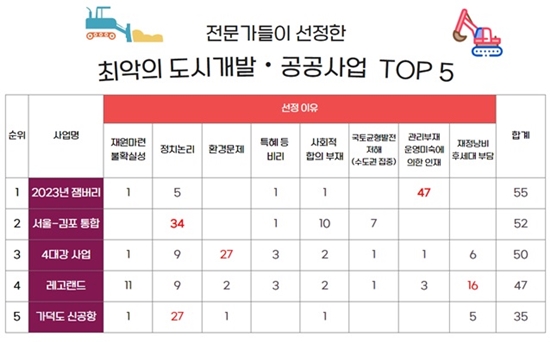 이어서 2위는 서울-김포 통합 계획, 3위는 4대강 사업, 4위는 레고랜드, 5위는 가덕도 신공항 순으로 뒤를 이었다. 고추 말리는 3형제 공항으로 오명을 받았던 무안, 청주, 양양 공항이 6위, 도시재생 사업, 새만금 사업, 대구 신공항, 해운대 엘시티 사업이 10위 안에 들었다. 경제정의실천시민연합(아래 경실련) 도시개혁센터와 시사저널이 공동으로 진행한 ‘최악의 도시개발·공공사업 전문가 설문조사’ 결과 발표에 따르면 이같이 나타났다. 전문가 108명이 뽑은 사업은 전체 550개 사업으로 이 가운데 잼버리가 55개로 가장 많았고, 서울-김포 통합이 52개였다. 조사 결과에서 전문가들이 2023년 잼버리를 최악의 사업으로 선정한 압도적인 이유로 55명 응답자 중 47명이 ‘관리 부재 운영 미숙에 의한 인재’를 꼽고 “이런 사태를 예방하기 위해서는 책임소재 규명과 책임자 문책이 이루어져야 한다”라는 의견도 내놓았다. 2위 서울-김포 통합 계획을 최악으로 꼽은 이유는 ‘정치 논리’가 가장 많았다. 전문가들은 “국토 균형발전을 저해하고, 수도권 집중을 강화하는 것으로 선거철 반복되는 선심성 구호에 지나지 않는다”라고 비판했다. 3위인 4대강 사업은 단연 ‘환경문제’가 가장 많은 선정 이유로 꼽혔다. 전문가들은 “운하는 바다가 없는 나라에서 만드는 것이고, 독일의 운하는 식수로 사용하지 않으며, 독일은 서안해양성 기후라 여름에는 건조하고 겨울에는 고온다습하다”라고 설명했다. 4위 레고랜드는 ‘재정낭비 후세대 부담’과 ‘재원 마련 불확실성’을 이유로 들었다. 전문가들은 “건설부지에 대규모 유적지의 존재를 인지하고도 개발 논리를 앞세워 사업을 강행했고 운영 부실, 미미한 경제효과와 더불어 프로젝트 파이낸싱의 부실한 운용으로 국가 신용도가 하락하고 200조원 규모의 자금을 낭비한 대표적인 실패 사업 사례”라고 비판했다. 5위인 가덕도 신공항은 ‘정치논리’가 가장 큰 이유였다. 전문가들은 “신공항의 기능과 모습에 대한 마스터 플랜이 불확실한 상황에서 추진되고 있는 것이 가장 큰 문제”라고 지적했다. 경실련은 “지금까지 진행된 도시개발‧건설 및 공공사업들과 현재 추진 중인 사업 중에서 국민과 언론의 관심을 받았고 받는 몇 개의 대표적인 사업들을 선정하고, 이들 중 어떤 사업들을 실패한 사업 또는 실패할 사업이라고 보고 있고 그 원인은 무엇인지에 관련한 전문가 설문조사를 진행했다”라고 밝혔다. 경실련은 “이번 조사는 3월 15일부터 25일까지 열흘간 도시 관련 학회 등을 통해 설문지를 배포하고 온라인으로 답변받는 방식으로 진행됐고 도시 전문가 108명이 참여했다”라고 조사 기간과 조사 개요를 설명했다. 경실련은 이어 “22대 총선에서도 새로운 개발 공약 사업들이 남발될 가능성이 높다”라며 “그동안 선거 시기 막대한 혈세가 투입되는 공공사업이 전문성 없는 정치인의 표 얻기로 활용되어 막대한 예산 낭비와 사회적 갈등이 발생하여 왔다”라고 지적했다. 경실련은 “결국 건설대기업들의 영리 추구 수단으로 악용되었고 이로 인한 피해는 모두 해당 지역 주민과 혈세를 납부한 국민에게 전가되어 왔다”라며 “경실련은 22대 국회의원 후보자들에게 나라의 미래를 고려해 장기적이고 종합적인 정책과 공약을 마련해줄 것을 당부한다”라고 밝혔다. 경실련은 마지막으로 “시사저널과 공동으로 22대 총선 후보자들의 선거공보가 발표된 이후 이들의 개발 공약도 분석해 발표할 예정이다”라고 덧붙였다.