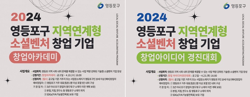 영등포구(구청장 최호권)가 “지역사회의 다양한 현안을 해결할 수 있는 창의적인 아이디어와 기업을 발굴하기 위해 ‘2024 영등포구 지역연계형 소셜벤처 창업기업’을 모집한다”고 밝혔다. 이번 모집은 ▲사회적 가치 실현, ▲지속 가능한 기업의 생태계 기반 조성, ▲안정적인 일자리 창출을 통해 지역을 발전시키고자 소셜벤처 기업을 육성 및 지원하는 사업이다. 지역 문제 해결을 위한 창업 아이디어를 보유하거나 지속적인 활동 의지가 있는 구민 또는 영등포구를 주 소재지로 하는 (예비)창업가라면 누구나 참여할 수 있다. 이번 프로그램은 ▲소셜벤처 창업 아카데미와 ▲창업 아이디어 경진대회 총 2가지로 구성되어 있다. ‘소셜벤처 창업 아카데미’는 창업에 관심 있는 누구나 간단한 신청을 통해 수강할 수 있으며, 기본·심화과정으로 나누어 창업 및 ESG와 관련한 전반적인 교육을 지원한다. 창업 아이디어를 이미 보유한 구민 및 관내 기업은 5월 초 ‘창업 아이디어 경진대회’에 참여할 수 있다. 경진대회의 경우, 총 15개 팀을 선발해 이틀간 창업과 관련한 강의와 1:1 컨설팅 등 사업유형에 맞는 별도의 프로그램을 지원하고, 참가자들은 결과물을 발표하며 대회를 진행한다. 참가 대상은 공고일 기준 주민등록상 거주지가 관내인 19세 이상 예비 창업자이며, 개인 또는 팀(팀장 포함 5인 이내) 단위로 참여 가능하다.